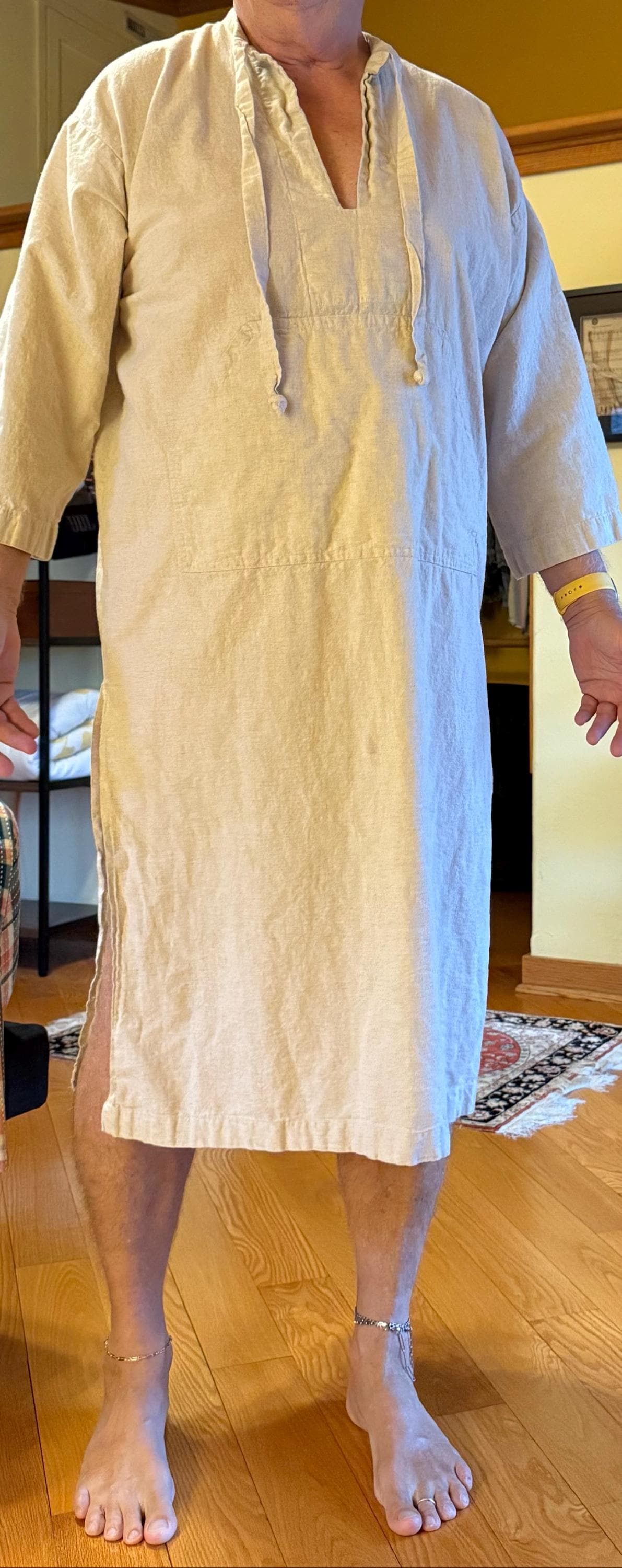 Mens midcalf kaftan, cotton gauze hemp beige , homewear, loungewear night gown, pool party loose plus size caftan